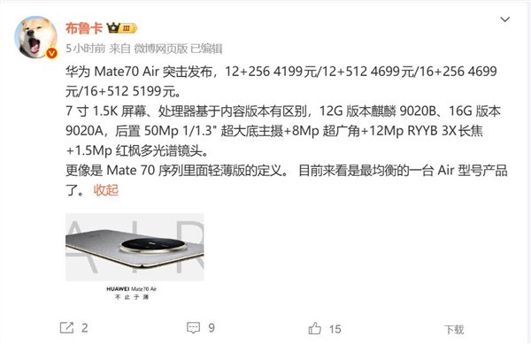 快科技11月6日消息,星纪魅族员工布鲁卡表示,华为Mate 70 Air更像是Mate 70序列里面轻薄版的定义,目前来看是最均衡的一台Air型号产品了。
